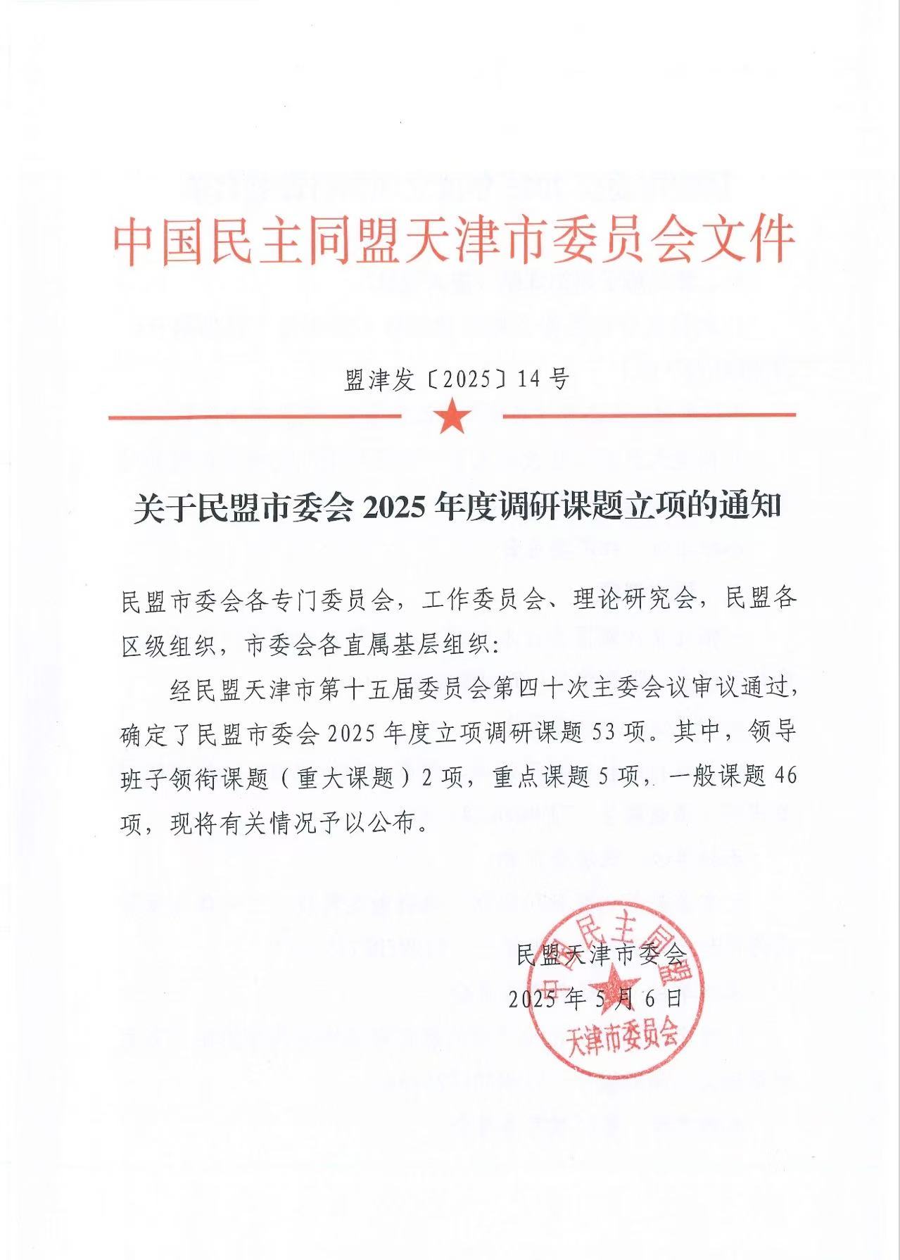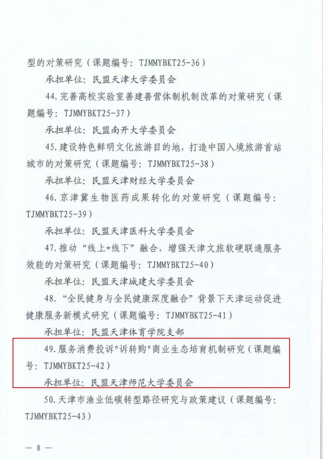 近日,民盟天津市委会印发《关于民盟市委会2025年度调研课题立项的通知》,确立了民盟市委会立项调研课题。其中,由我校经济学院缪言副教授申报的《以培育“诉转购”商业生态机制赋能服务消费提振》获得年度一般课题立项。